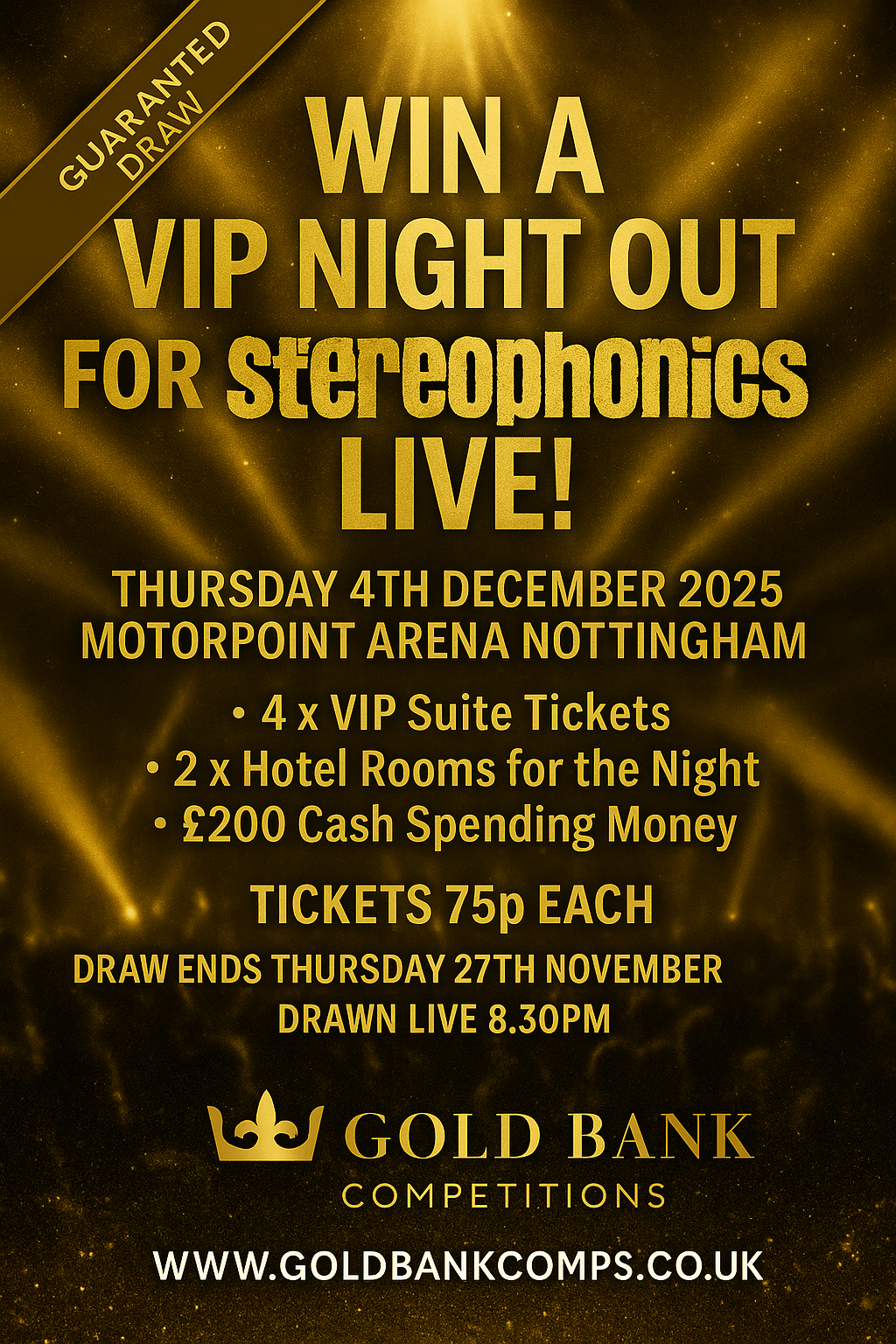 Get ready for an unforgettable night of live music as Gold Bank Comps gives you the chance to experience Stereophonics LIVE at the Motorpoint Arena Nottingham — in true VIP style!