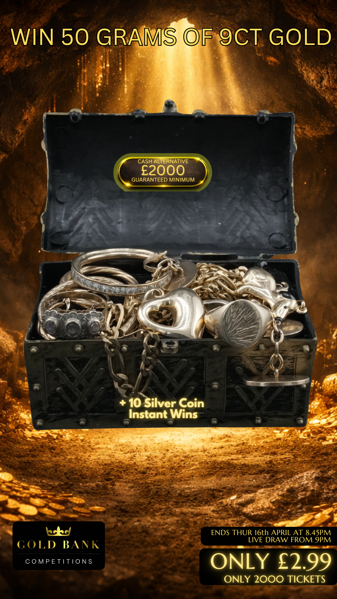 We’re giving you the chance to win a solid 50 grams of 9CT gold, presented as a stunning treasure-style haul – professionally tested and verified by Gold Bank Jewellers.