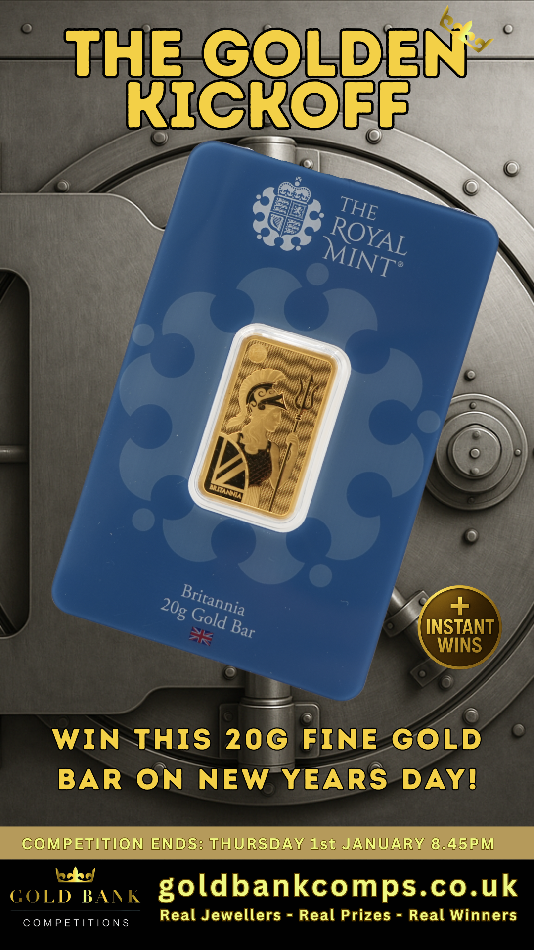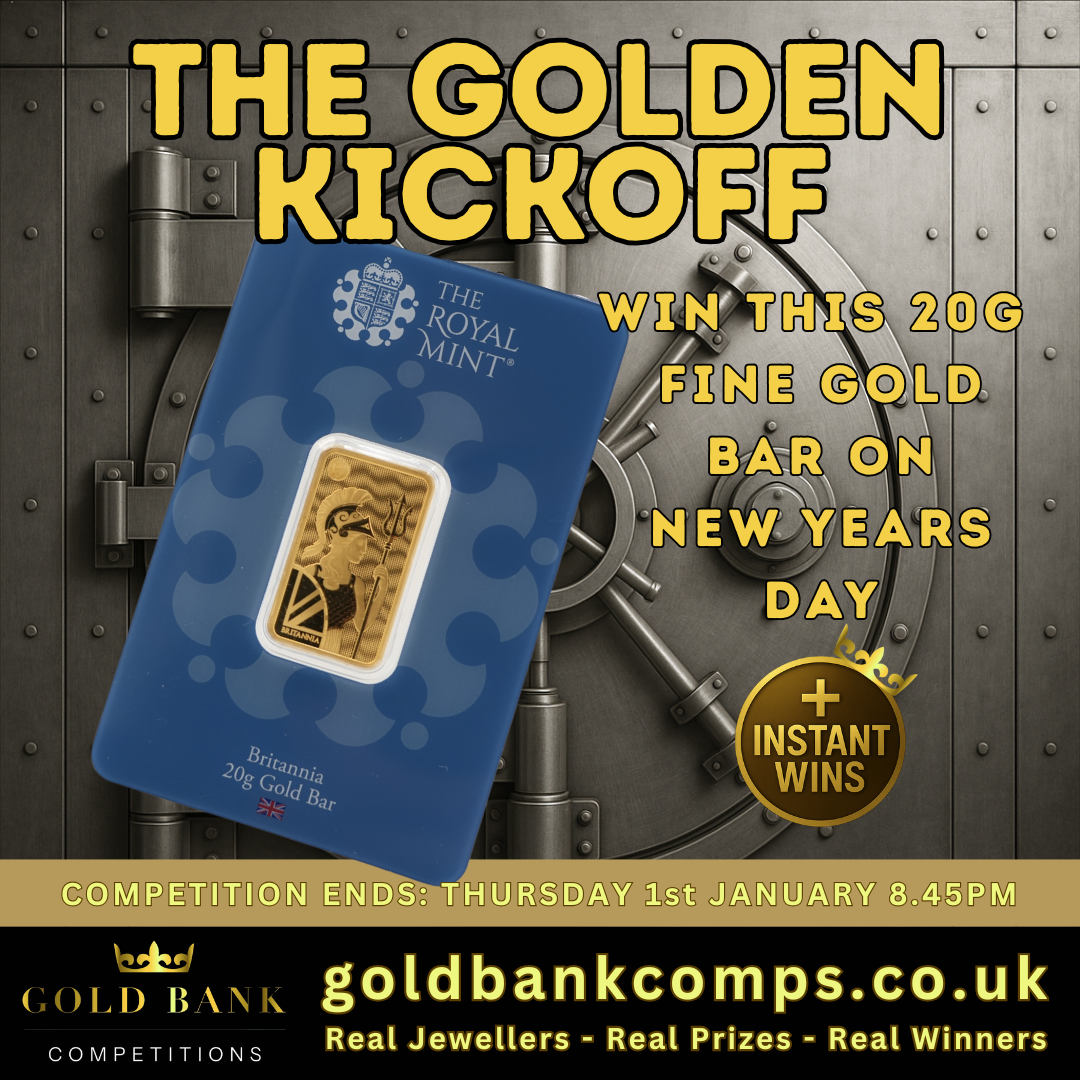 Kick off the New Year in pure gold with The Golden Kickoff β your chance to win a solid 20 gram Fine Gold bar, supplied by real jewellers and fully verified.