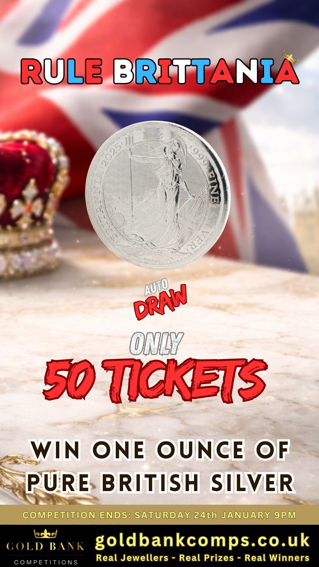 You may enter the competition online or for free by post by sending your entry to JWE Competitions Limited operating as Gold Bank Competitions on a postcard. You must have an account on JWE Competitions Limited operating as Gold Bank Competitions for your entry to be processed. All details on your entry MUST correspond to the details on your account to receive the order confirmation and ticket number. Postal entries received without a registered account cannot be processed.
