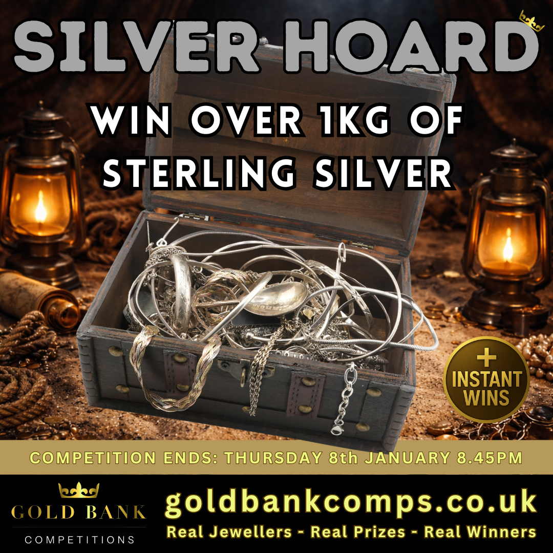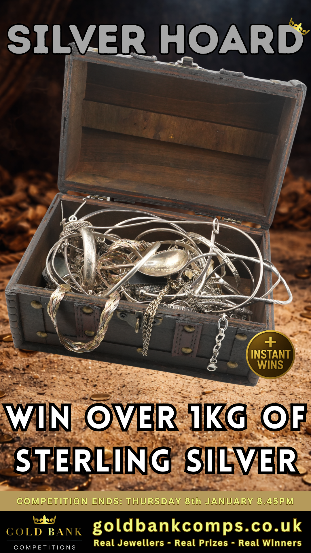 Weโre giving one lucky winner over 1KG of sterling silverย โ a substantial collection packed with rings, chains, bracelets, spoons and more. Real silver, professionally sourced and verified by Gold Bank Jewellers.