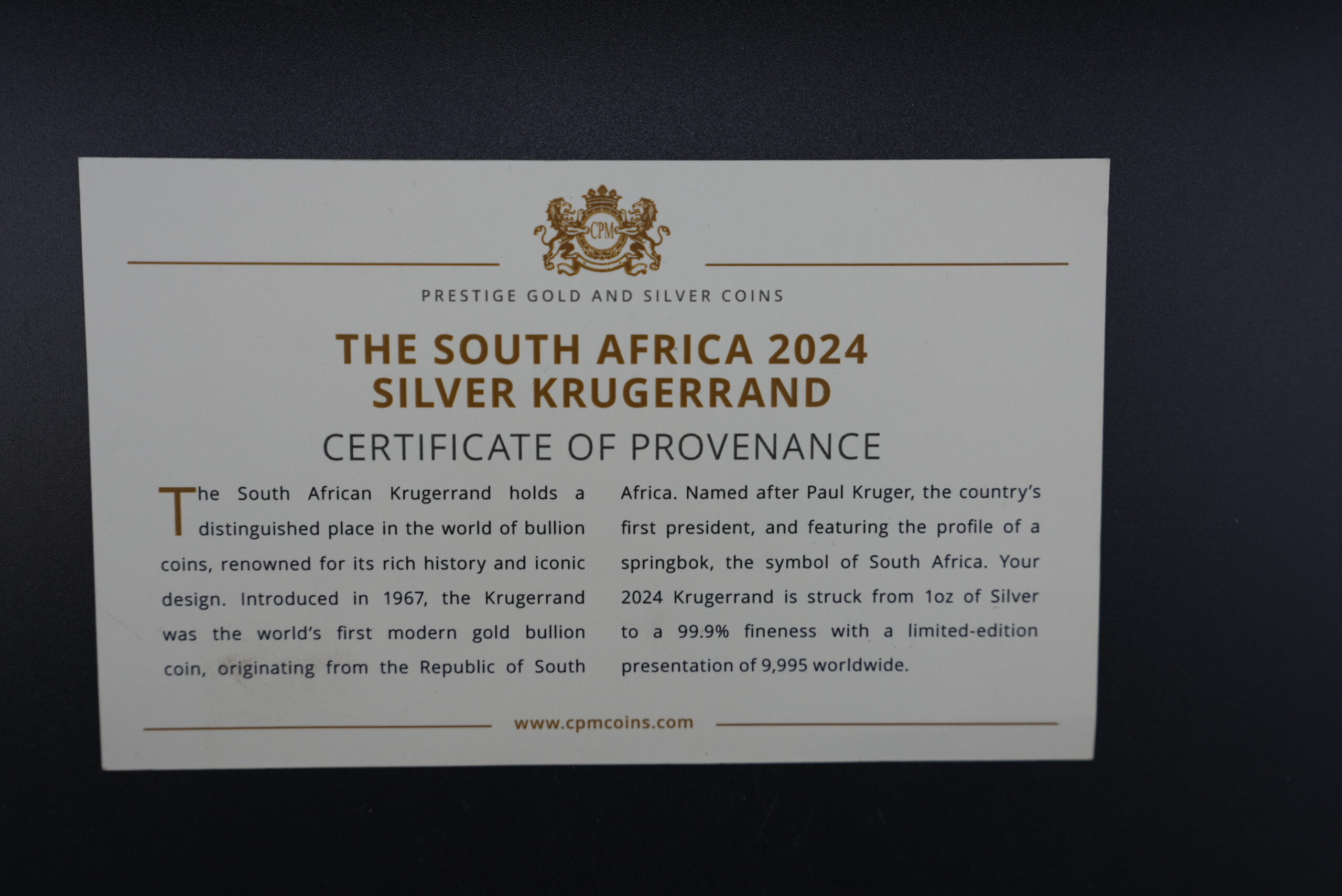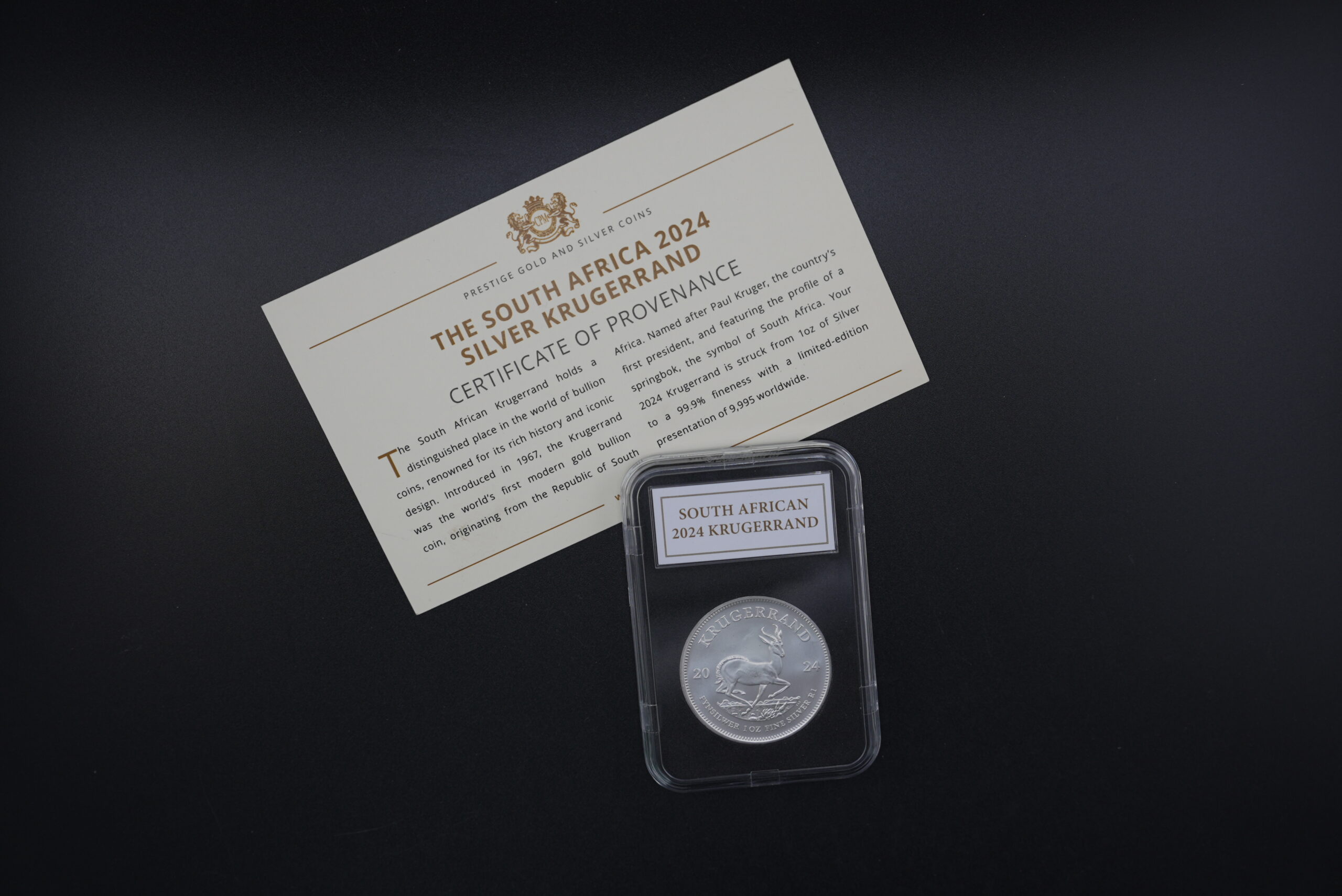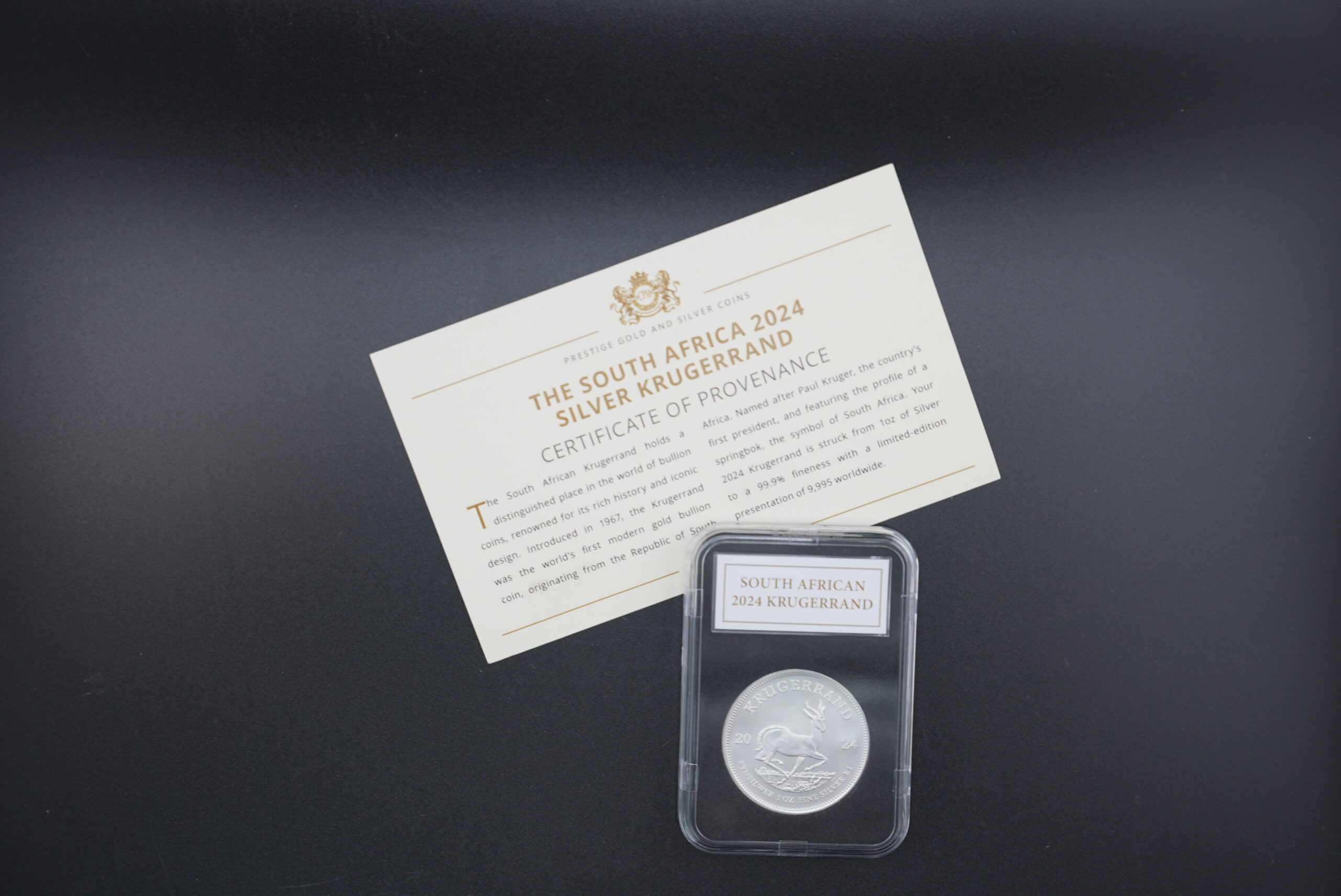 This is not your standard loose bullion coin — this is a presentation-issued 2024 Silver Krugerrand, complete with official Certificate of Provenance and protective display case.