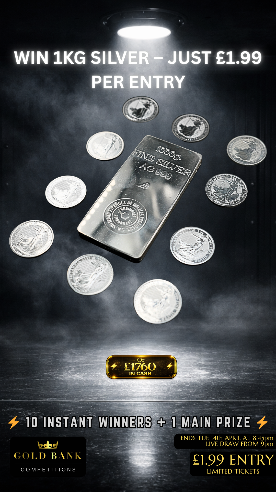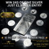 This is the one everyone waits for. A full 1KG Fine Silver Bar — serious weight, serious value, and one of the most sought-after prizes we run.