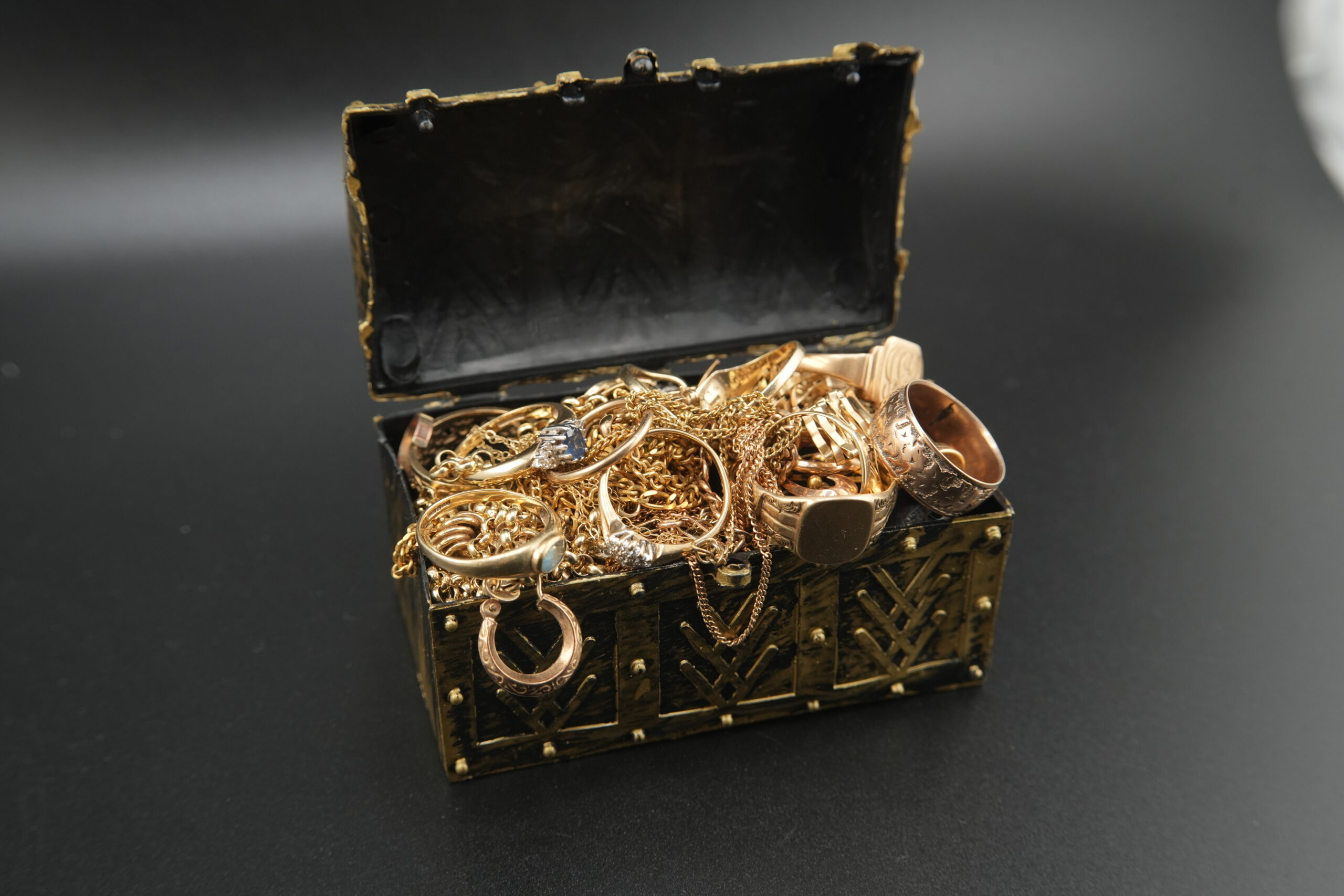 Unlock your very own treasure chest packed with 75 grams of real assorted 9ct gold, fully tested and verified by Gold Bank Jewellers. Each treasure chest is created from gold jewellery we’ve purchased in store — X-ray tested, weighed and guaranteed. The items on the scale are the exact items you will receive!