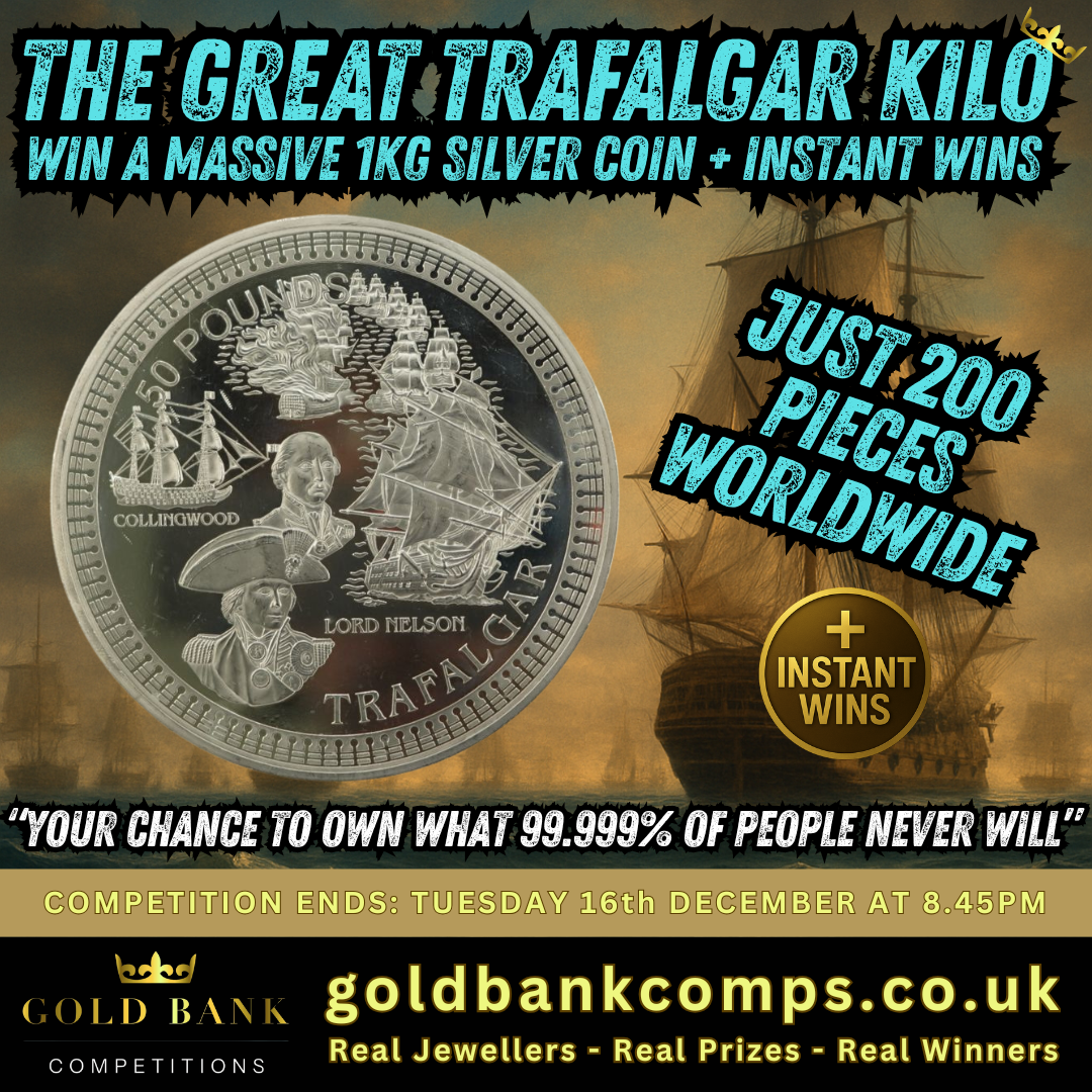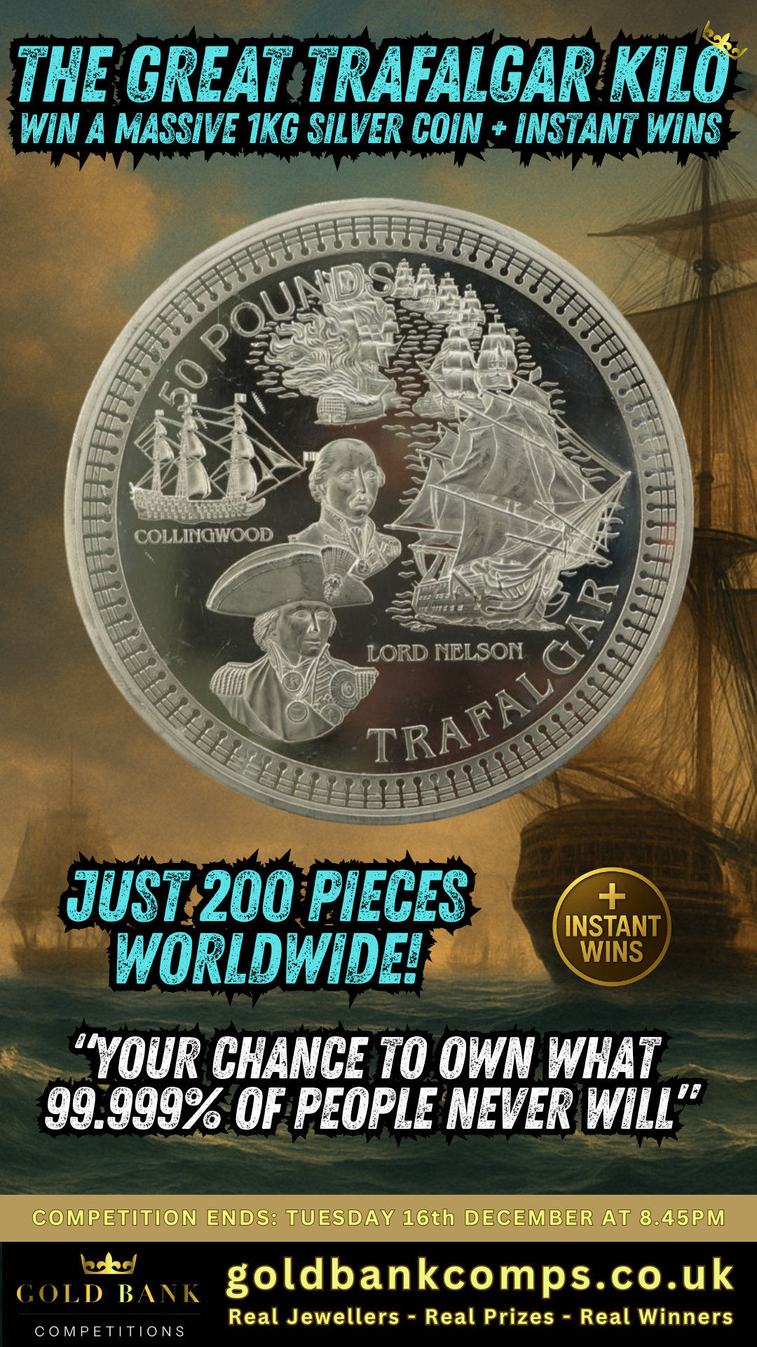 Struck in .999 Fine Silver, weighing a full kilogram, and produced to the Royal Mint’s highest proof standard, this stunning piece features intricate designs honouring Admiral Lord Nelson and one of the most decisive battles in British history.