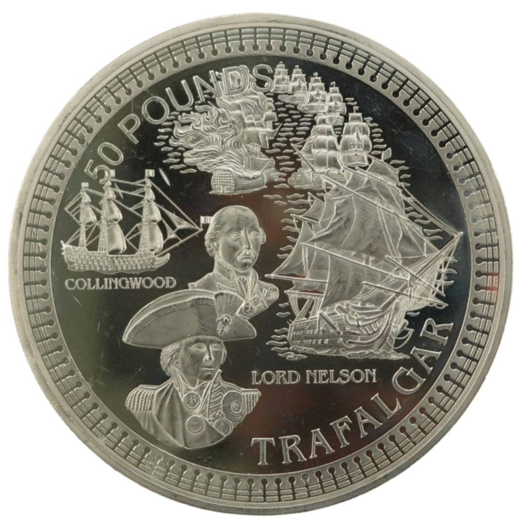 Features Horatio Nelson, The Victory, Collingwood’s ship, and the £50 denomination — all beautifully detailed in a historically themed montage created by the Royal Mint.