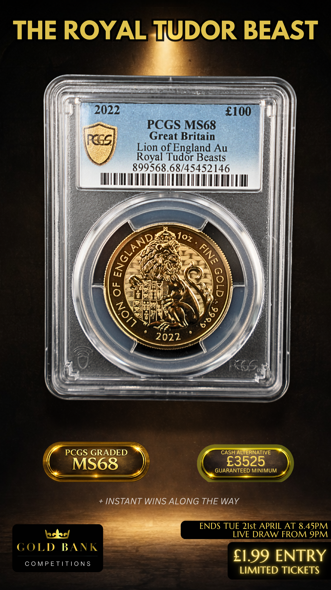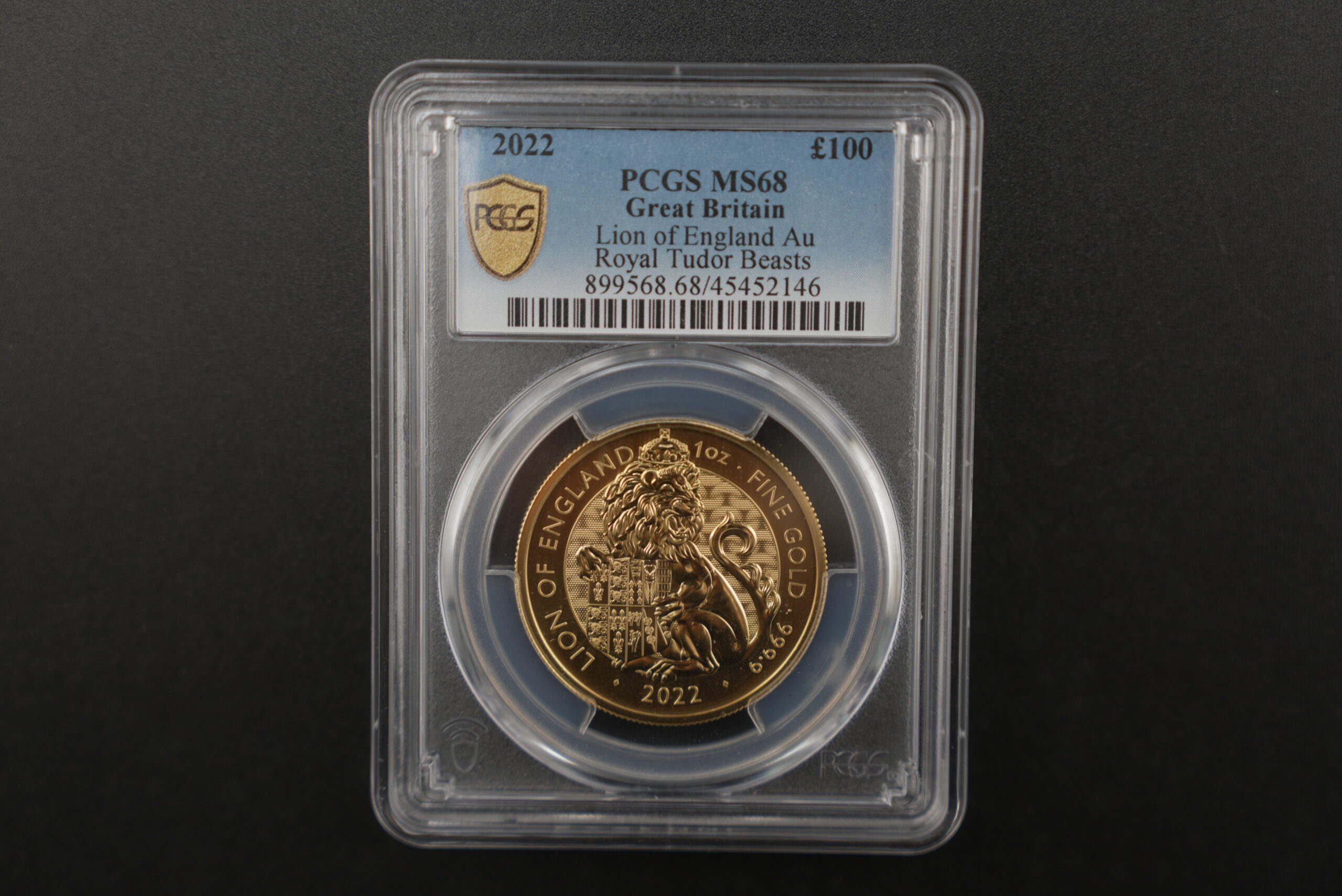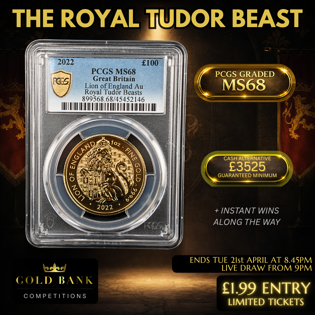 A truly premium piece of British bullion — the 1oz Fine Gold Royal Tudor Beast, graded and encapsulated by PCGS for added authenticity and collectability.